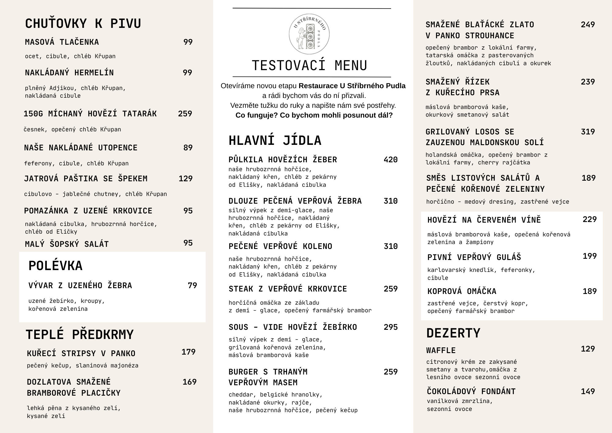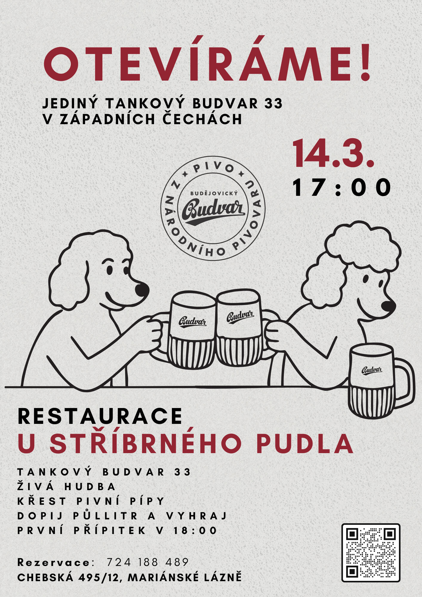 Partner, který zůstává národním pivovarem a jehož smysl pro kvalitu a otevřenost přirozeně souzní s naší vizí.U Stříbrného Pudla čepujeme Budvar 33 z tanku. Světlý ležák s výraznější, ale vyváženou hořkostí, který vznikl pro moderní gastronomii a funguje stejně dobře samostatně jako v kombinaci s jídlem. Tanková technologie nám umožňuje podávat pivo ve stabilní kondici, s maximální čerstvostí a bez zbytečných zásahů mezi pivovarem a sklem.Stejnou pozornost věnujeme i tomu, jak se pivo dostane na stůl. Pečlivě se staráme o pivní cesty, pravidelně je čistíme, důsledně myjeme a temperujeme sklo a čepujeme výhradně na hladinku, tak aby vynikla chuť i charakter piva. Máme za sebou roky zkušeností s výčepem a právě z nich čerpáme při každém čepování, tak abychom hostům podávali pivo v kondici, jakou si zaslouží.K tomu nabízíme Budvar nealko a Budvar tmavý ležák, aby si každý mohl vybrat podle chuti i nálady. Velmi nás těší, že Budějovický Budvar dlouhodobě spolupracuje s českými minipivovary a společně s nimi vaří limitované edice pivních speciálů. Každý měsíc tak u nás najdete jiný speciál z minipivovaru z aktuální spolupráce, která propojuje tradici velkého pivovaru s energií současné pivní scény.Pivo u nás není doplněk k jídlu, ale rovnocenná součást celku – stejně jako moderní česká kuchyně, lokální suroviny a přirozená pohostinnost.