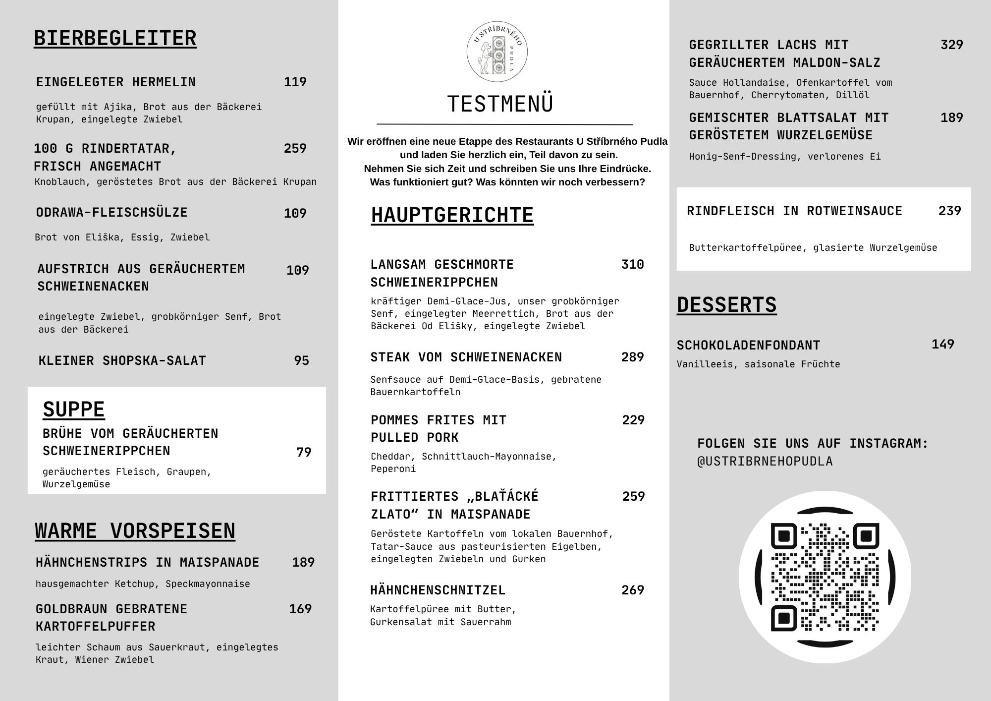 Partner, který zůstává národním pivovarem a jehož smysl pro kvalitu a otevřenost přirozeně souzní s naší vizí.U Stříbrného Pudla čepujeme Budvar 33 z tanku. Světlý ležák s výraznější, ale vyváženou hořkostí, který vznikl pro moderní gastronomii a funguje stejně dobře samostatně jako v kombinaci s jídlem. Tanková technologie nám umožňuje podávat pivo ve stabilní kondici, s maximální čerstvostí a bez zbytečných zásahů mezi pivovarem a sklem.Stejnou pozornost věnujeme i tomu, jak se pivo dostane na stůl. Pečlivě se staráme o pivní cesty, pravidelně je čistíme, důsledně myjeme a temperujeme sklo a čepujeme výhradně na hladinku, tak aby vynikla chuť i charakter piva. Máme za sebou roky zkušeností s výčepem a právě z nich čerpáme při každém čepování, tak abychom hostům podávali pivo v kondici, jakou si zaslouží.K tomu nabízíme Budvar nealko a Budvar tmavý ležák, aby si každý mohl vybrat podle chuti i nálady. Velmi nás těší, že Budějovický Budvar dlouhodobě spolupracuje s českými minipivovary a společně s nimi vaří limitované edice pivních speciálů. Každý měsíc tak u nás najdete jiný speciál z minipivovaru z aktuální spolupráce, která propojuje tradici velkého pivovaru s energií současné pivní scény.Pivo u nás není doplněk k jídlu, ale rovnocenná součást celku – stejně jako moderní česká kuchyně, lokální suroviny a přirozená pohostinnost.